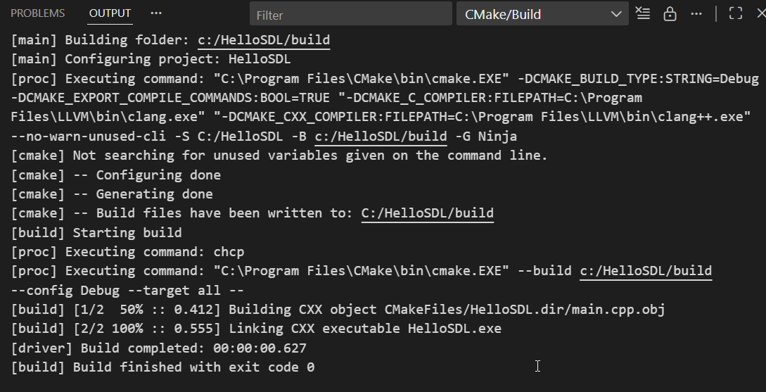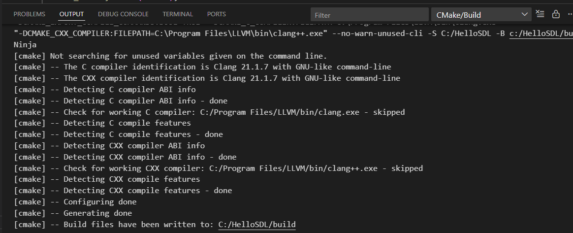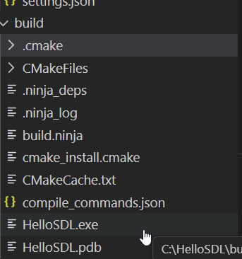 Take a look at the last line. It reads: “Build files have been written to: C:/HelloSDL/Build”. The path in this message may differ depending on your operating system.
