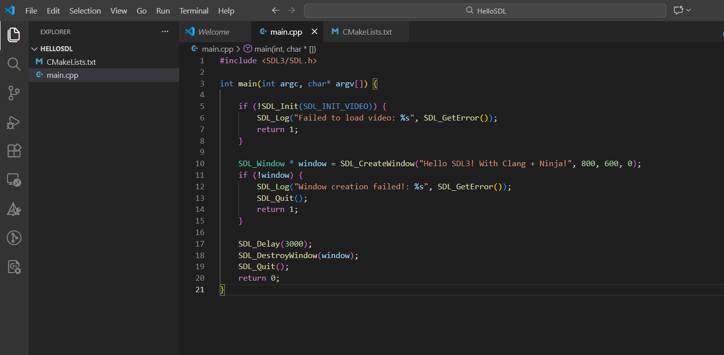 target_link_libraries(${PROJECT_NAME} PRIVATE SDL3::SDL3)As you can see in the CMakeLists.txt file we’re finding the SDL3 library and linking it to our project.