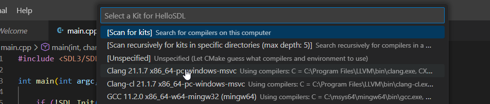 Click on CMake: Select a Kit.