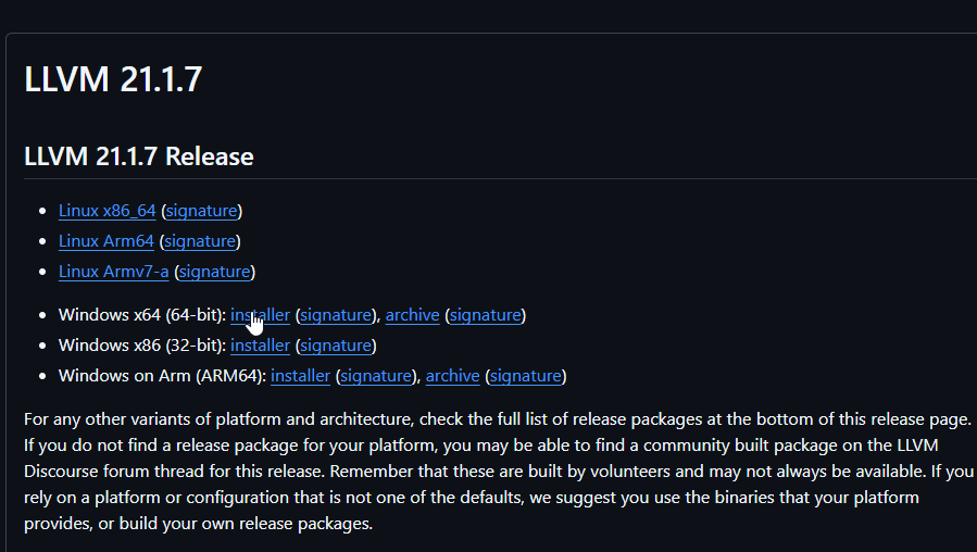 If you’re on Windows, head to the official LLVM releases on GitHub and grab the latest Windows installer. You can look for its link under the Links section in this guide, all the way to the bottom.
