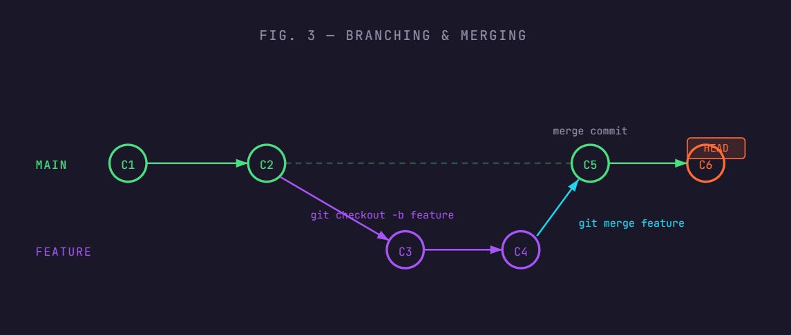 Then, happy with the result, you merged it back into main as commit C5, bringing in all those changes cleanly.